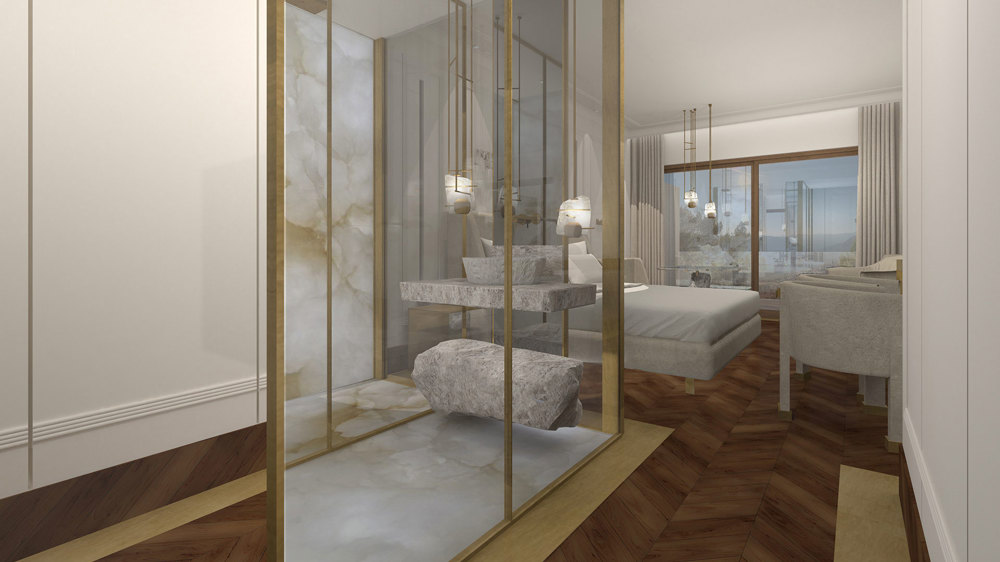 Deluxe mountain-view room with stone sink, modern lighting, and elegant earthy tones in Royal Marmin Arachova